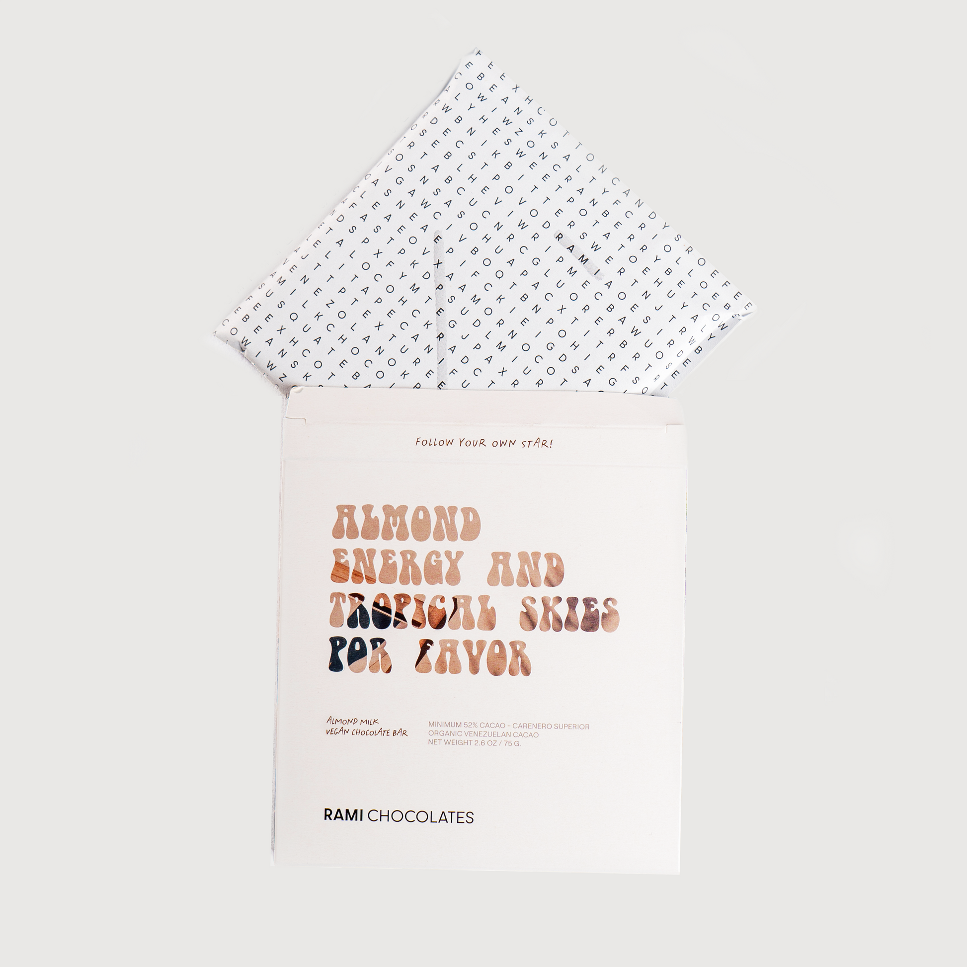 Ingredients: Vegan Chocolate (cocoa butter, almond milk, monk fruit), less than 2% of vanilla bean powder. It may content soy lecithin as an emulsifier.