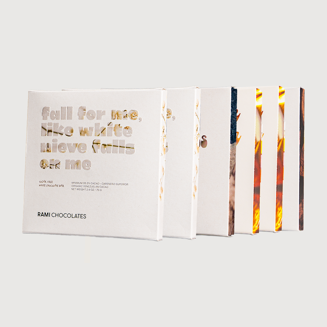 - Pick between: Almond Milk Vegan Chocolate, Sugar Free Dark Chocolate, Sugar Free Golden Milk Chocolate, Sugar Free White Chocolate